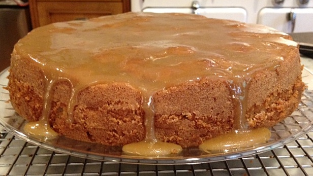 The only "trick" to this recipe is that you must make the caramel glaze while the cake is baking because it needs to cool and then be poured on the warm cake. Below is the start of the glaze. The recipe calls for one teaspoon of corn syrup to enhance the texture of the glaze. Do not skip this ingredient: the Karo Syrup sold in supermarkets and used in recipes like this is not the devil high-fructose corn syrup.